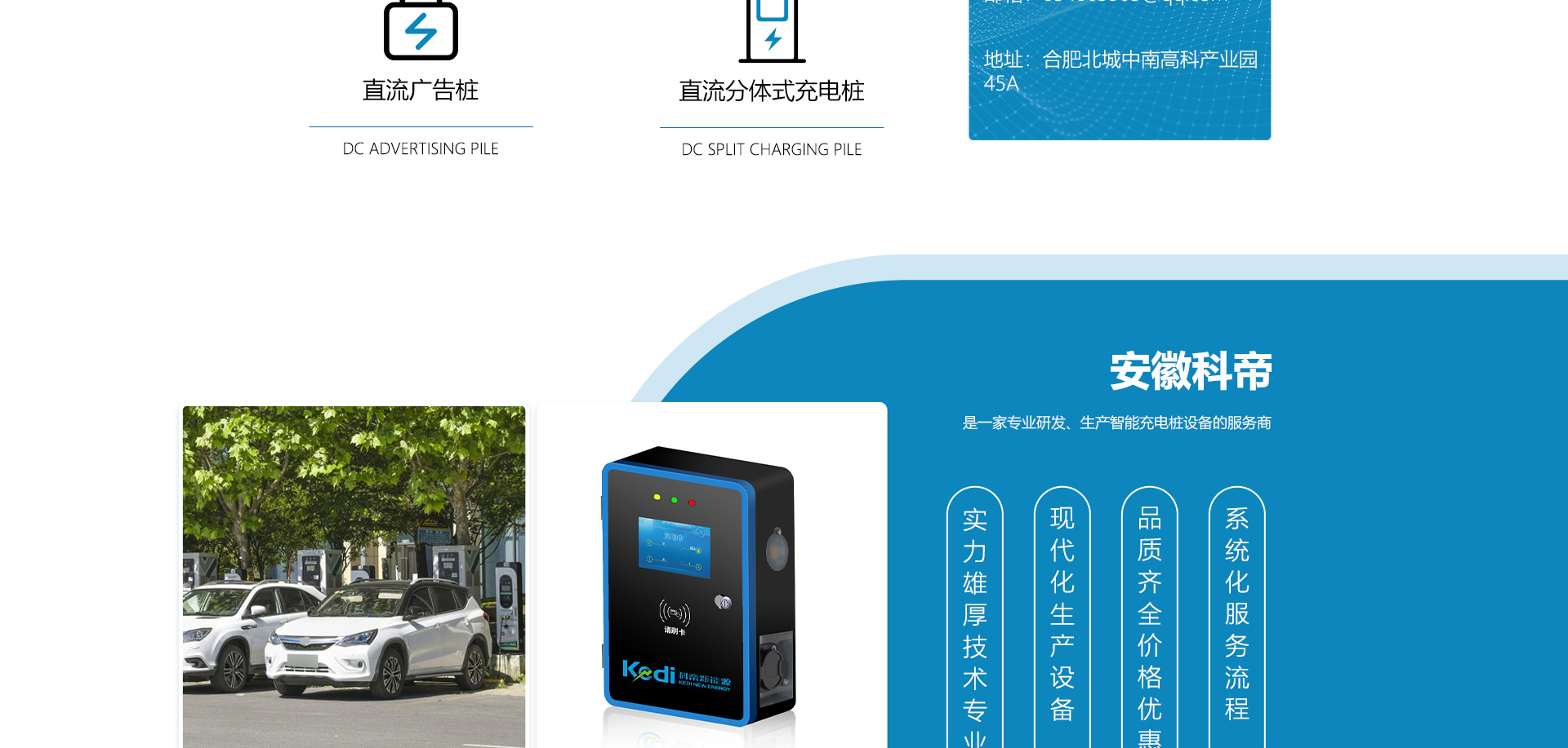 关于我们安徽科帝新能源科技有限公司坐落于安徽省会-合肥,是一家研发、生产智能充电桩设备,汽车充电站后台监控管理系统和生产高压开关设备的企业.由专门的研发团队、管理团队按照现代化企业制度规范设立的有限责任公司。致力于为能源智能、安全的应用和节能减排提供整体的技术与产品解决方案。科帝集研发、设计、生产、销售以及服务于一体,在电动汽车充电方案,充电设施建设和城市配电方面拥有广泛的技术研究及经验积累,为客户提供安全、智能的充电设备及充电运营站建设一体化解决方案。并坚持以人为本、质量为先、顾客至上、不断创新”的企业理念,为能源行业的发展、节能减排做出重大的贡献。公司拥有丰富的产品种类,目前科帝已研发生产了三十多种产品,充电设备有直流一体式充电桩、直流分体式充电桩、直流广告桩、交流广告桩、广告一体桩、壁挂交直流桩;等多种充电设备;每一款产品都是精心打造,力求为客户提供优越的用户体验。展望未来科帝将通过持续的自...
